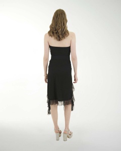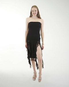 VESTIDO DE ANTRO, DE FALDA CON ABERTURAS CON DETALLES DE ESCAROLAS, ESCOTE EN STRAPLESS Y CINTURON.