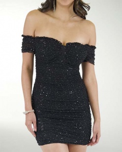 VESTIDO DE ANTRO, ESTILO CORRUGADO CON BRILLOS, CON COPAS DE ESCOTE RECTO Y HOMBROS DESCUBIERTOS.