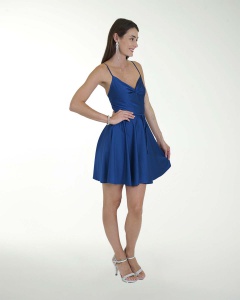 VESTIDO DE LA LINEA ANTRO, EN TELA SATINADA DE FALDA CIRCULAR, ESCOTE EN V DRAPEADO Y TIRANTES.