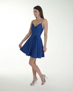 VESTIDO DE LA LINEA ANTRO, EN TELA SATINADA DE FALDA CIRCULAR, ESCOTE EN V DRAPEADO Y TIRANTES.