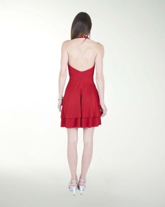 VESTIDO DE LA LINEA ANTRO, EN TELA SATINADA DE FALDA CIRCULAR, ESCOTE EN V DRAPEADO Y TIRANTES.