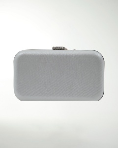BOLSO DE MANO, ESTILO RECTANGULAR, DE BROCHE CON DECORADO DE HOJA Y CORREA TIPO CADENA.