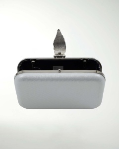 BOLSO DE MANO, ESTILO RECTANGULAR, DE BROCHE CON DECORADO DE HOJA Y CORREA TIPO CADENA.