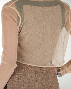CHALINA CONFECCIONADA EN TELA TRANSPARENTE CON DESTELLOS DE BRILLO Y DE MANGAS LARGAS.