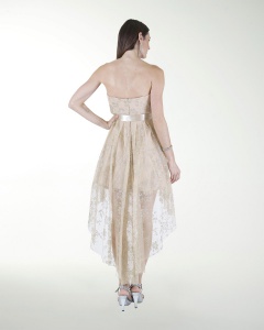 VESTIDO COCKTAIL CORTO, ESTILO EN DESNIVEL EN TELA BORDADA EN FLORES Y ESCOTE RECTO EN STRAPLESS.
