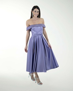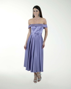 VESTIDO COCKTAIL CORTO, ESTILO MIDI EN SATIN, FALDA EN TABLONES, ESCOTE RECTO Y DE HOMBROS DESCUBIER