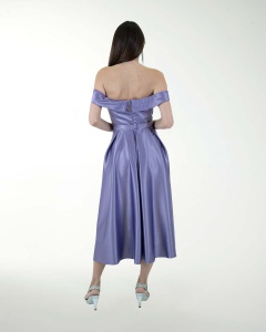 VESTIDO COCKTAIL CORTO, ESTILO MIDI EN SATIN, FALDA EN TABLONES, ESCOTE RECTO Y DE HOMBROS DESCUBIERTOS.