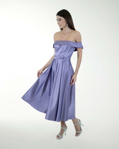 VESTIDO COCKTAIL CORTO, ESTILO MIDI EN SATIN, FALDA EN TABLONES, ESCOTE RECTO Y DE HOMBROS DESCUBIER