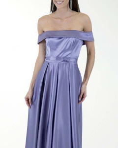 VESTIDO COCKTAIL CORTO, ESTILO MIDI EN SATIN, FALDA EN TABLONES, ESCOTE RECTO Y DE HOMBROS DESCUBIERTOS.