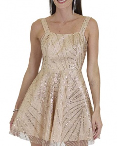 VESTIDO COCKTAIL CORTO, CON DESTELLOS DE BRILLO, ESCOTE RECTO Y CON AMARRE DE MOÃO EN LA ESPALDA.