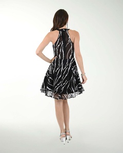 VESTIDO COCKTAIL CORTO, ESTILO PRINCESA ESTAMPADO, ESCOTE TIPO HALTER Y TRANSPARENCIA EN LA ESPALDA.