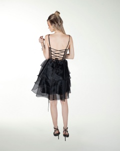 VESTIDO COCKTAIL CORTO, FALDA EN TUL EN OLANES, TALLE TIPO CORSET TRANSPARENTE CON BRILLOS Y ESCOTE