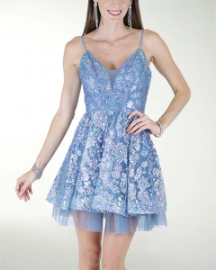 VESTIDO COCKTAIL CORTO, DE DOBE FALDA EN TUL ESTAMPADO, ESCOTE EN V CON TRANSPARENCIA Y TIRANTES.
