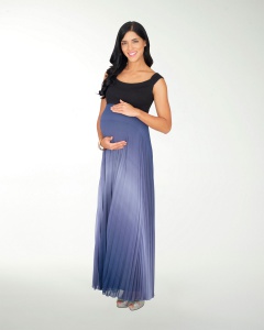 VESTIDO DE MATERNIDAD, COMBINADO DE FALDA PLISADA EN DEGRADE, TALLE LISO Y HOMBROS DESCUBIERTOS.