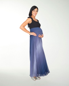 VESTIDO DE MATERNIDAD, COMBINADO DE FALDA PLISADA EN DEGRADE, TALLE LISO Y HOMBROS DESCUBIERTOS.