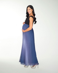 VESTIDO DE MATERNIDAD, COMBINADO DE FALDA PLISADA EN DEGRADE, TALLE LISO Y HOMBROS DESCUBIERTOS.