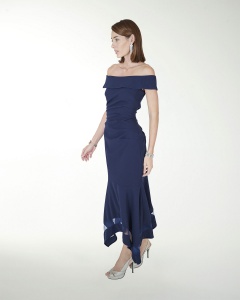 VESTIDO COCKTAIL LARGO, ENTALLADO CON DRAPEADO, TRANSPARENCIA EN EL RUEDO Y DE HOMBROS DESCUBIERTOS.
