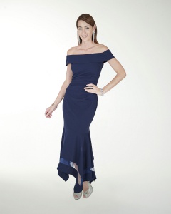VESTIDO COCKTAIL LARGO, ENTALLADO CON DRAPEADO, TRANSPARENCIA EN EL RUEDO Y DE HOMBROS DESCUBIERTOS.