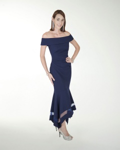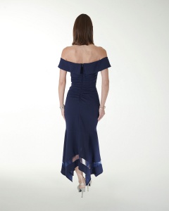 VESTIDO COCKTAIL LARGO, ENTALLADO CON DRAPEADO, TRANSPARENCIA EN EL RUEDO Y DE HOMBROS DESCUBIERTOS.