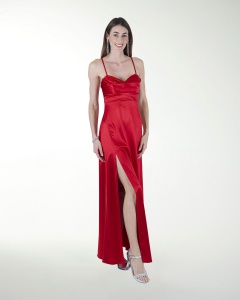 VESTIDO COCKTAIL LARGO, EN TELA SATINADA, CON ESCOTE DRAPEADO, ABERTURA LATERAL Y TIRANTES.