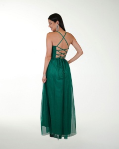 VESTIDO COCKTAIL LARGO, CON DESTELLOS DE BRILLO, ESCOTE RECTO CON DRAPEADO Y AMARRE CON JARETAS.