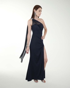VESTIDO COCKTAIL LARGO, ESTILO ENTALLADO, ESCOTE RECTO DE UN HOMBRE CON DRAPEADO Y ABERTURA LATERAL.