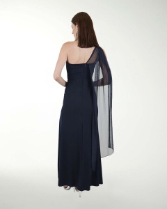 VESTIDO COCKTAIL LARGO, ESTILO ENTALLADO, ESCOTE RECTO DE UN HOMBRE CON DRAPEADO Y ABERTURA LATERAL.