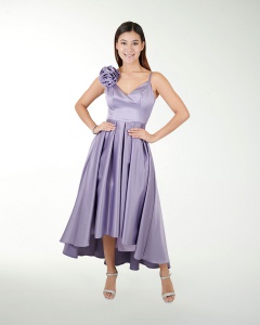 VESTIDO COCKTAIL LARGO, EN RASO DE FALDA TABLEADA EN DESNIVEL, ESCOTE TIPO V Y DETALLE DE FLOR .