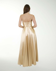 VESTIDO COCKTAIL LARGO, EN RASO DE FALDA AMPLIA, ESCOTE EN V TRANSPARENTE Y CINTURON EN PEDRERIA.