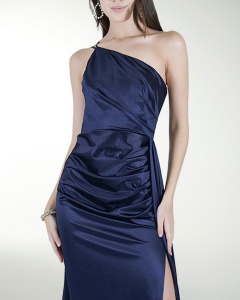 VESTIDO COCKTAIL LARGO, EN TELA SATINADA CON DETALLES DE DRAPEADO, ESCOTE ASIMETRICO Y DE UN HOMBRO.