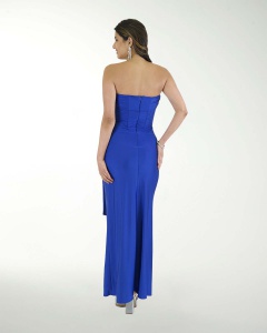 VESTIDO COCKTAIL LARGO, ENTALLADO CON DETALLES DE DRAPEADO, EN STRAPLESS DE ESCOTE RECTO Y ABERTURA.