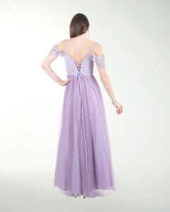 VESTIDO COCKTAIL LARGO, FALDA EN TUL, TALLE CON BRILLOS DE HOMBROS CAIDOS Y AMARRE CON JARETAS.