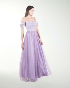 VESTIDO COCKTAIL LARGO, FALDA EN TUL, TALLE CON BRILLOS DE HOMBROS CAIDOS Y AMARRE CON JARETAS.