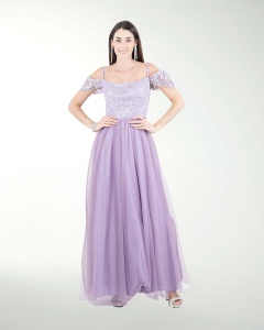 VESTIDO COCKTAIL LARGO, FALDA EN TUL, TALLE CON BRILLOS DE HOMBROS CAIDOS Y AMARRE CON JARETAS.