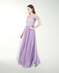 VESTIDO COCKTAIL LARGO, FALDA EN TUL, TALLE CON BRILLOS DE HOMBROS CAIDOS Y AMARRE CON JARETAS.