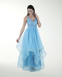 VESTIDO COCKTAIL LARGO, FALDA EN TUL A DESNIVEL CON GLITTER, TALLE CON BRILLOS Y ESCOTE EN V.