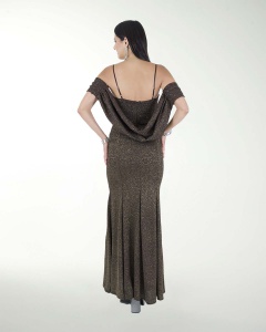 VESTIDO COCKTAIL LARGO, ESTILO SIRENA EN GLITTER, ESCOTE RECTO CON DRAPEADO Y HOMBROS DESCUBIERTOS.