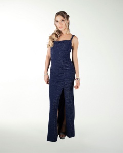 VESTIDO COCKTAIL LARGO, ENTALLADO CON DRAPEADO, FALDA CON ABERTURA Y ESCOTE RECTO CON TIRANTES.