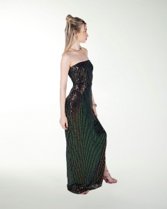 VESTIDO COCKTAIL LARGO, ENTALLADO EN LENTEJUELA, ESCOTE RECTO, CON ABERTURA Y AMARRE CON JARETAS.