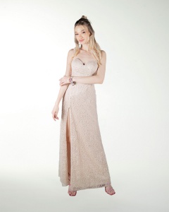 VESTIDO COCKTAIL LARGO, ENTALLADO FALDA CON ABERTURA, TALLE TIPO CORSET Y TIRANTES EN ESCAROLAS .