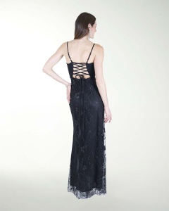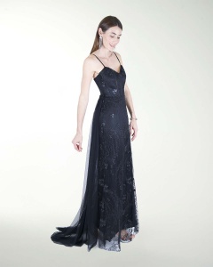 VESTIDO COCKTAIL LARGO, DE FALDA CON CAUDA EN TUL, TALLE EN CORSET, ESCOTE EN V Y AMARRE CON JARETAS.