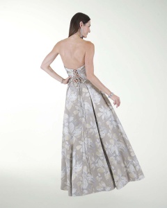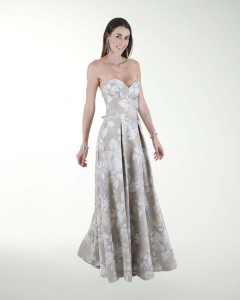 VESTIDO COCKTAIL LARGO, ENTAMPADO, TALLE EN STRAPLESS, ESCOTE EN CORAZON Y AMARRE CON JARETAS.