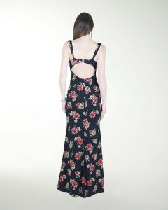 VESTIDO COCKTAIL LARGO, ESTILO RECTO EN TELA ESTAMPADA, CON ESCOTE RECTO Y DE ESPALDA DESCUBIERTA.