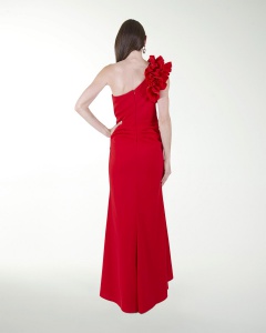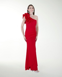 VESTIDO COCKTAIL LARGO, LISO CON DRAPEADO, ESCOTE EN DIAGONAL Y DE UN HOMBRO EN DETALLES DE ESCAROLA