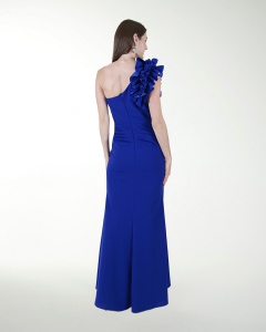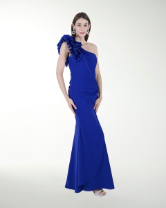 VESTIDO COCKTAIL LARGO, LISO CON DRAPEADO, ESCOTE EN DIAGONAL Y DE UN HOMBRO EN DETALLES DE ESCAROLA.