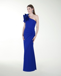 VESTIDO COCKTAIL LARGO, LISO CON DRAPEADO, ESCOTE EN DIAGONAL Y DE UN HOMBRO EN DETALLES DE ESCAROLA.