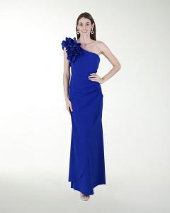 VESTIDO COCKTAIL LARGO, LISO CON DRAPEADO, ESCOTE EN DIAGONAL Y DE UN HOMBRO EN DETALLES DE ESCAROLA.
