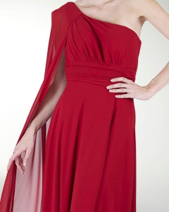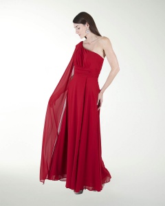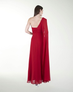 VESTIDO COCKTAIL LARGO, EN CORTE A EN CHIFON, ESCOTE EN DIAGONAL Y DE UN HOMBRO CON MANGA.
