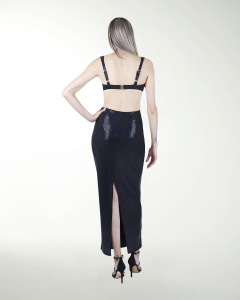 VESTIDO COCKTAIL LARGO, ESTILO CUT OUT ENTALLADO, DE ESCOTE CUADRADO Y TIRANTES ANCHOS.