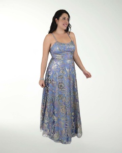 VESTIDO COCKTAIL LARGO, CON BRILLOS, DE FALDA SEMICIRCULAR, ESCOTE RECTO Y AMARRE CON JARETAS.